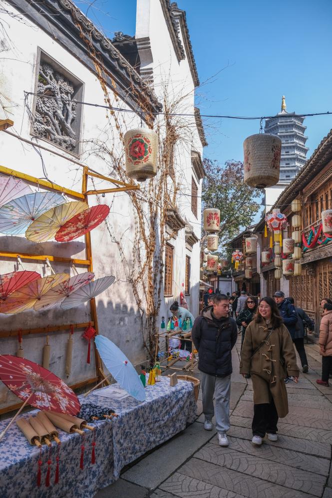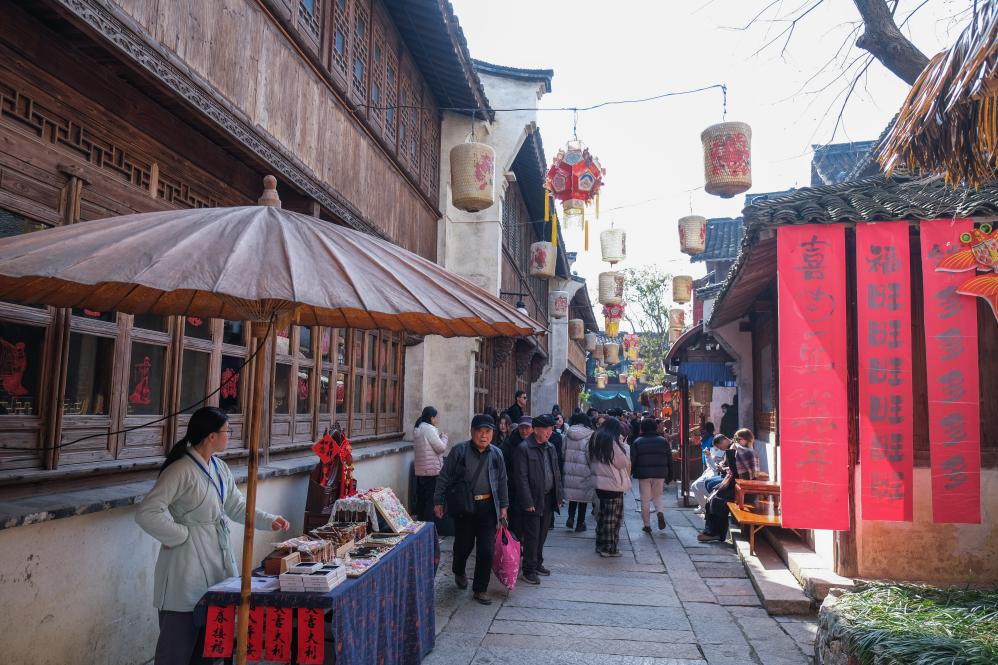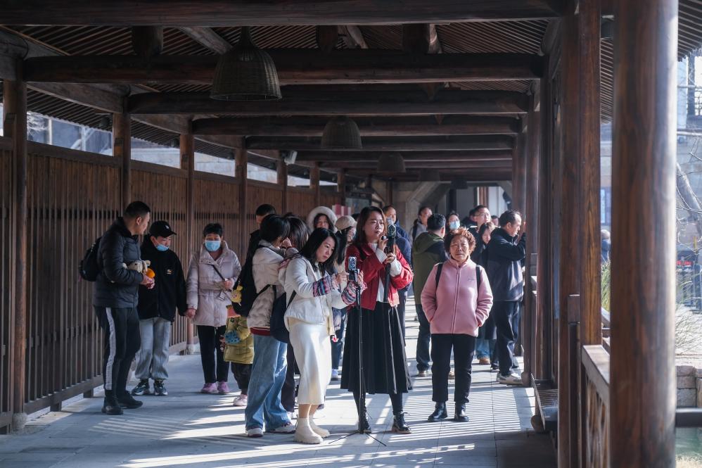 2月11日,游客在濮院时尚古镇感受传统年味。新华社记者 徐昱 摄