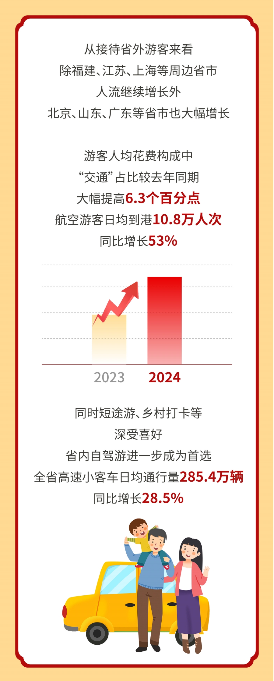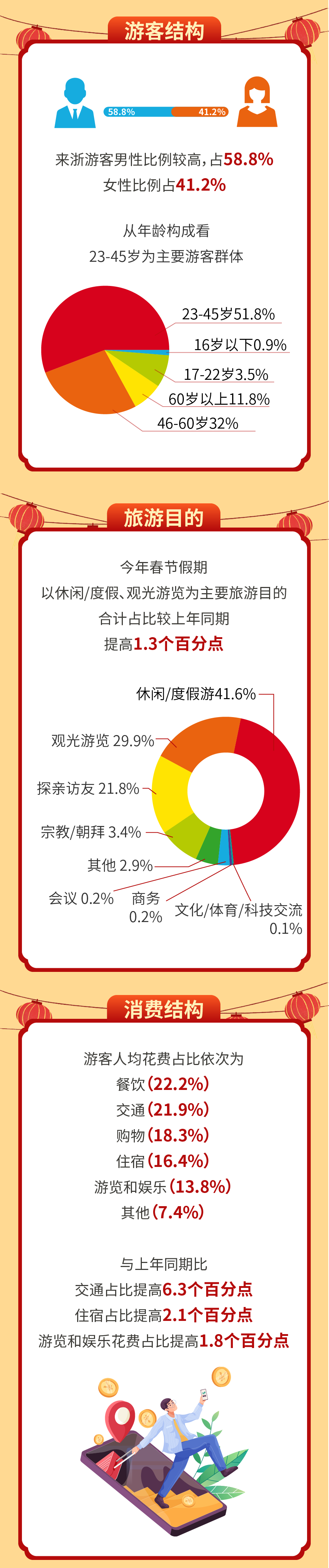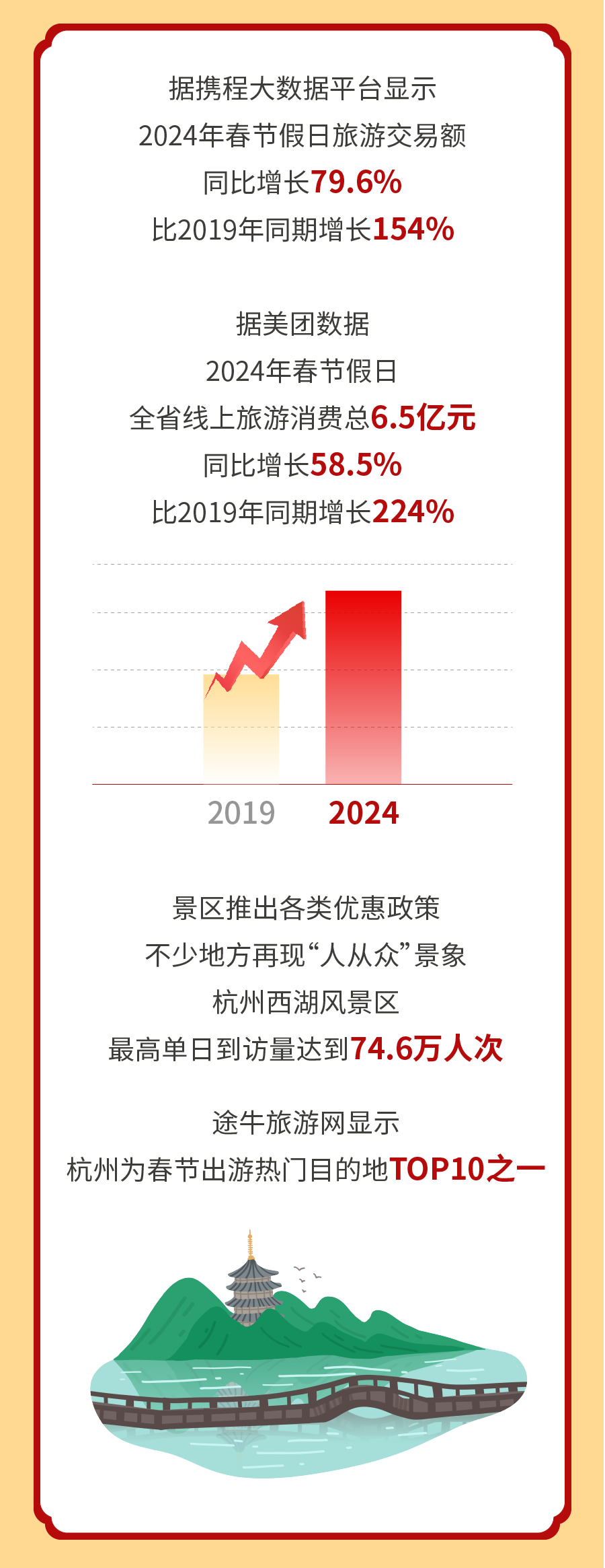 假期旅游市场持续升温,居民消费潜力不断释放。2024年春节期间,浙江累计接待游客3032.6万人次,全域旅游收入437.6亿元;全省银联商务累计消费金额达898.10亿元;长三角铁路假期8天发送旅客逾1700万人次。具体情况,一图纵览。