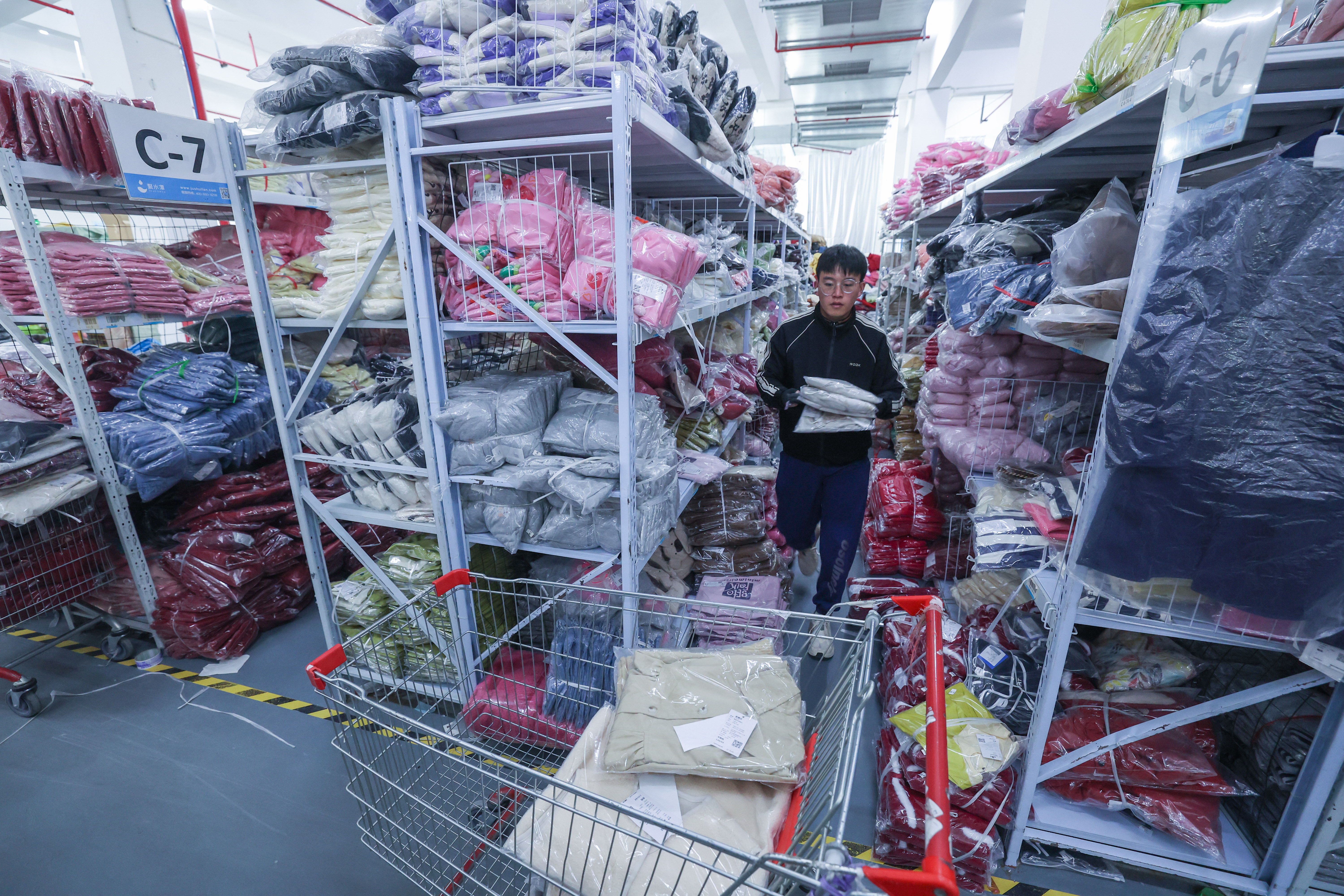 2月27日,在织里镇的童装产业园区内,工作人员在分拣即将发货的童装。新华社记者 徐昱 摄