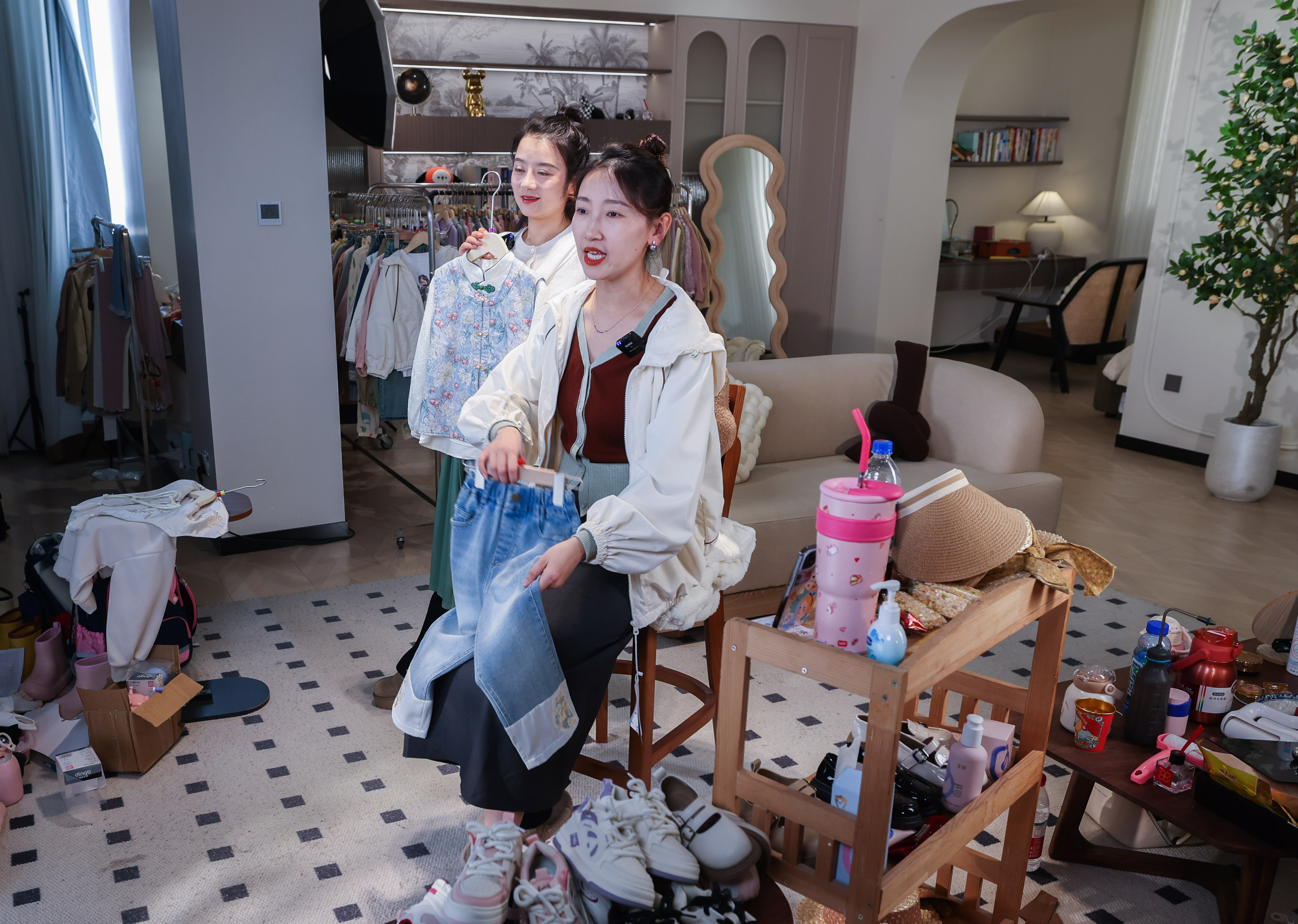 2月27日,位于织里镇的湖州煜心煜意服饰有限公司直播间内,主播在展示新款童装。新华社记者 徐昱 摄