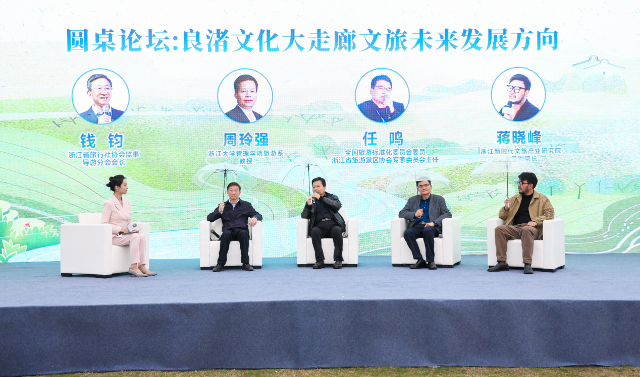 活动现场还举行了以良渚文化大走廊文旅未来发展为主题的圆桌论坛,邀请了浙江大学管理学院旅游系教授周玲强,全国旅游标准化委员会委员、浙江省旅游景区协会专家委员会主任任鸣,浙江省旅行社协会监事、导游分会会长钱钧,浙江新时代文旅产业研究院常务副院长蒋晓峰等文旅行业专家学者进行了一次思想碰撞,分别从文旅产业发展、文旅线路规划、文旅乡村运营、文旅营销推广等问题提出独到见解。