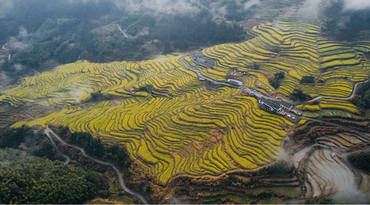 只见梯状的稻田里,一抹金黄格外显眼,层层叠叠的油菜花与一座座古色民居、群山相映生辉,宛如一张金黄的幕布盖在大地之上,在云雾弥漫的山间凸显出一抹别致美景。