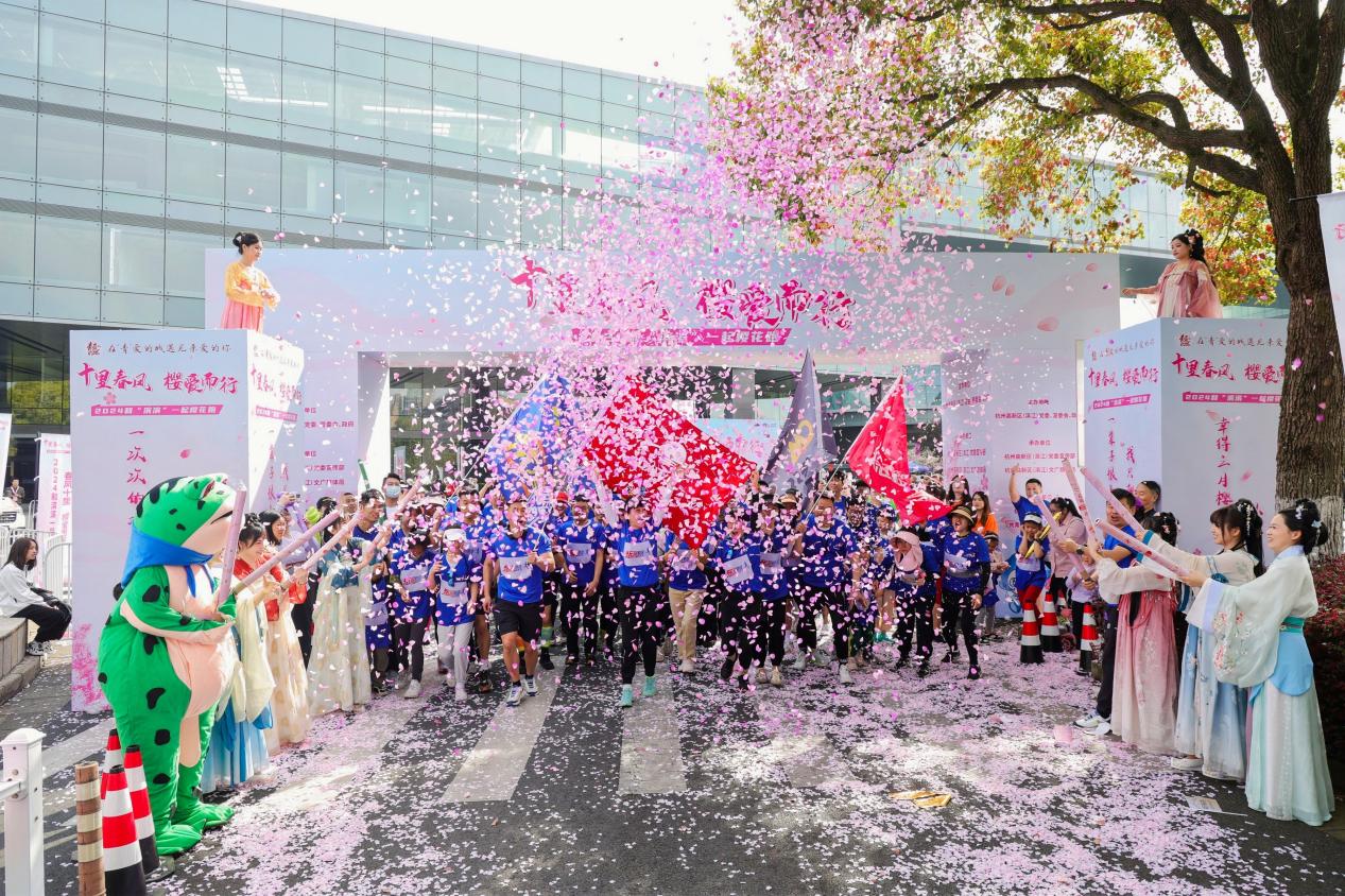 伴随着樱花拱门下的发令枪响,选手们身着青春活力的服装,穿梭在落英缤纷的樱花丛中,还有国潮爱好者身着汉服,为跑道增添一道靓丽的风景线。