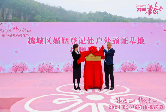 这场集体婚礼是2024古城青春季暨“缘起运河 情定吼山”第28届吼山桃花节开幕式上的一项活动。同天上午,还发布了吼山景区手绘旅游线路地图,并揭牌了越城区首个户外结婚登记颁证基地和首个婚姻协会婚纱摄影基地。