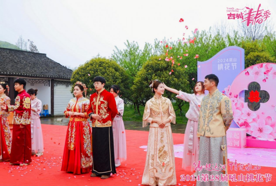 在户外的场地前,8对身着秀禾的新人,在众人的注视下,双双登堂。春色满山,新人们以吼山的十里桃林为背景,相继行却扇礼、沃盥礼、三拜之礼、结发礼、合卺礼,并领取了婚书。礼毕,新人们还进行了游园,在景区各处赏花、拍照、挂同心锁。