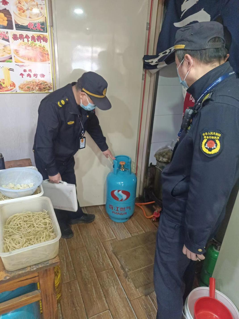 在此次专项整治工作中,执法人员重点对辖区内的沿街餐饮店和人员密集场所进行燃气安全隐患排查,整理辖区内仍在使用瓶装煤气的店家清单,着重检查其燃气供气来源是否合法合规,燃气器具是否超期使用,燃气瓶、灶具、减压阀、胶管等附属设施是否生锈、老化,燃气管道是否被占压等问题,并对经营者的瓶装燃气安全使用进行宣传引导,督促场所负责人严格按要求履行。