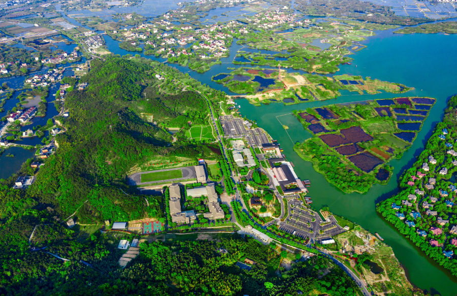 航拍下渚湖湿地风光。华夏银行杭州分行供图