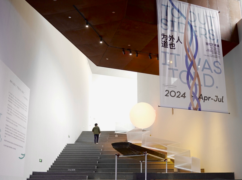 艺术中心亮相后的首场综合艺术展览是由TOPO STUDIO与葛宇路联合策划呈现的《为外人道也》,标题和立意则取自《桃花源记》中的居民们对外人的回应:“不足为外人道也”。展览邀请了7位国内外知名声音艺术家结合现场空间进行创作。通过装置以及光影等表达手法,用舞台的方式让观众化身为意外闯入的渔人,以呈现前往精神桃源秘境的曲折通途。入口处的主题装置《忘路之远近》通过透光板、灯带等一系列现代工业材料,还原了自然空间中的长河落日,再与丽水瓯江边牵来的渔船作为在地文化的象征。