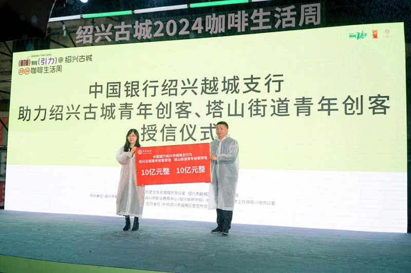 启动仪式上,绍兴古城咖啡生活周活动主题LOGO首次发布,这标志着“绍兴古城咖啡生活周”IP的正式诞生。绍兴古城青年创客咖啡联盟进行现场授牌。同时,中国银行越城支行还现场授信绍兴古城青年创客10亿元、授信塔山青年创客10亿元,为绍兴古城的青年创客们提供更大的发展空间和资金支持。