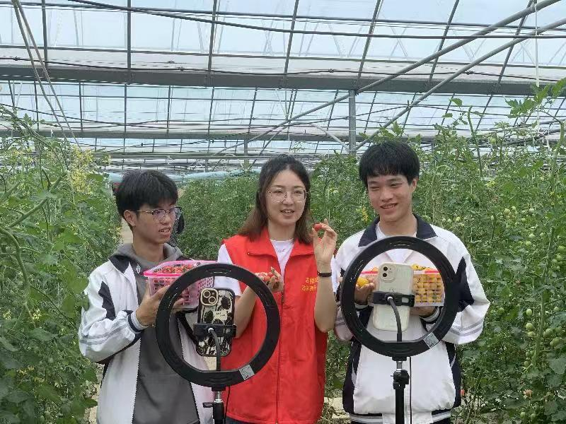 “今天我们向大家推荐的浙樱粉小番茄,来自我身后的大棚,我手中的番茄荣获2024浙江好番茄金奖,味道清爽,酸酸甜甜……”“石榴红”电商班的学生化身主播正在大棚里讲解。