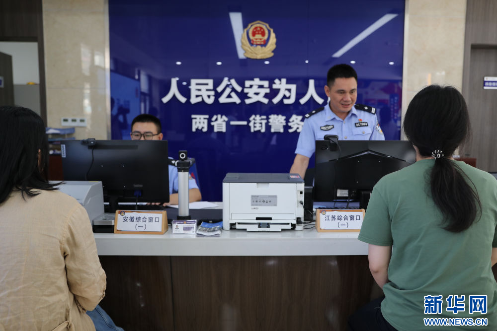 2023年6月2日,安徽的辅警(左二)和江苏的民警(右二)在丹阳警务室政务服务窗口为人们办理业务。安徽马鞍山博望区丹阳镇与江苏南京江宁区丹阳社区相毗邻,2023年年2月底,苏皖“两省一街”丹阳警务室政务服务窗口正式揭牌,在两地交界区域实体化运行。新华社记者 杜潇逸 摄