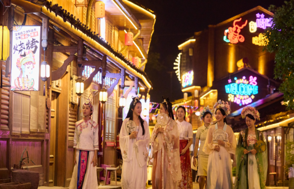 赤石乡“嗨周末”特色街区灯火辉煌。“这里可以吃到好吃的小吃、烧烤,还可以穿着汉服拍照打卡,氛围超级棒。”年轻游客小冯说。