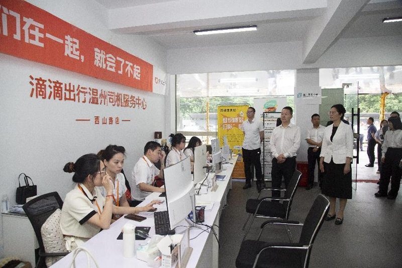 温州市各级工会相关人员在瓯海区新桥网约车司机之家城市驿站观摩。温州市总工会供图
