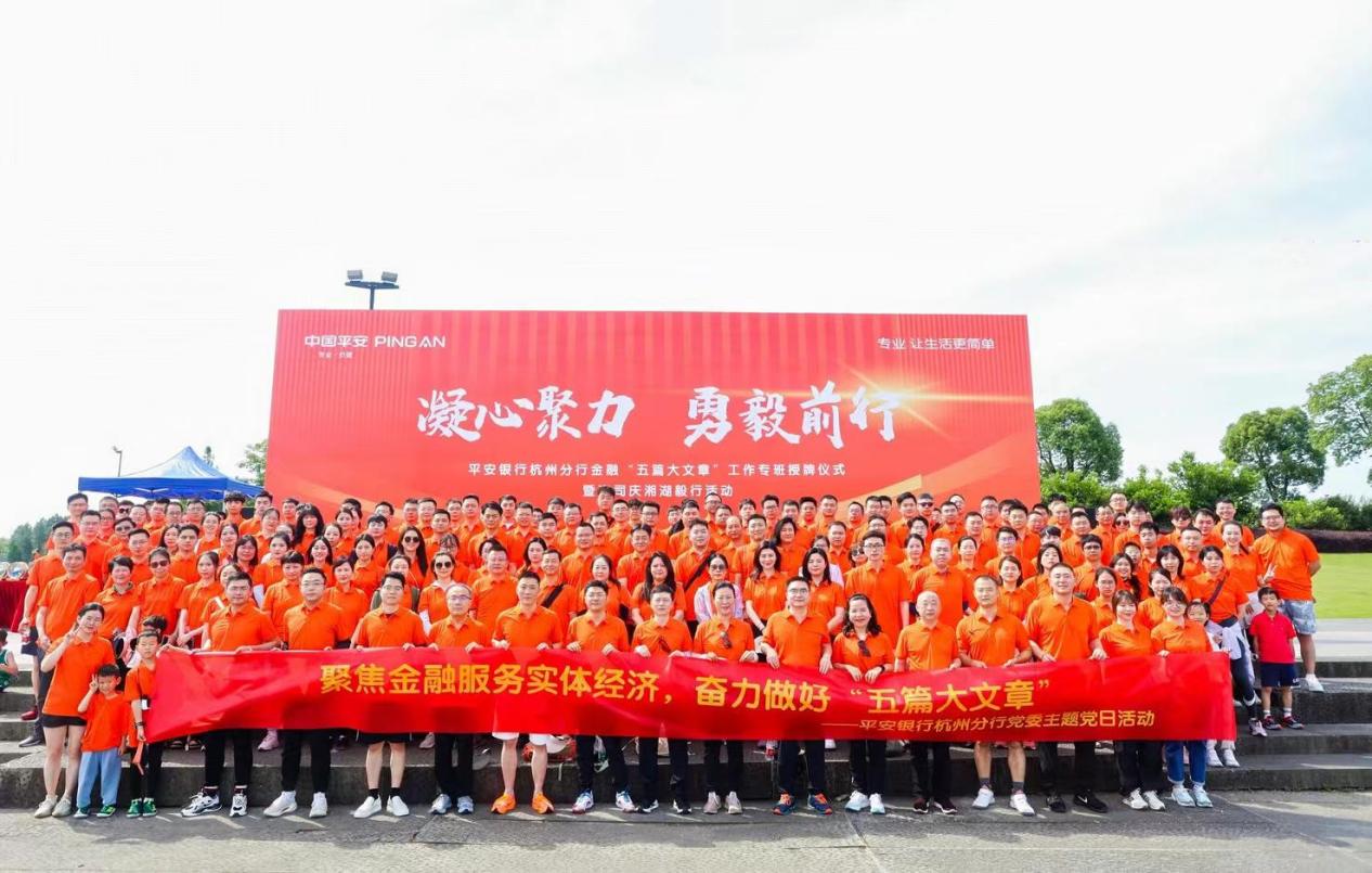 近日,平安银行杭州分行在杭州举行金融“五篇大文章”工作专班授牌仪式暨迎司庆湘湖毅行活动,全辖员工代表共200余人参加。