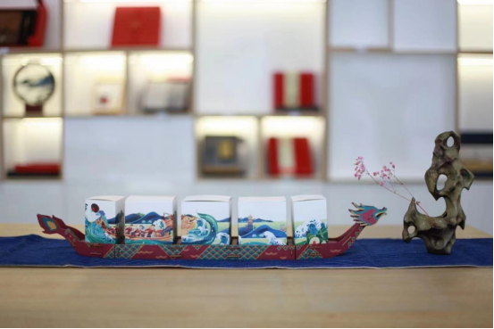 不仅如此,以瓯海特色龙舟文化为消费内核的“龙舟文创”如今也越来越受到关注。端午节前,瓯海文创企业迎来龙舟产品销售季,五色龙、龙舟旗、龙舟桨……与龙舟相关的产品走俏,木龙舟果盘、龙舟积木、龙舟手提灯、龙舟茶具......以龙舟文化为主题的创意产品深受大家喜爱。