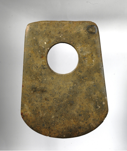 石钺:肩宽12.4厘米,刃宽16.8厘米,高22.4厘米,孔径6厘米,国家一级文物。