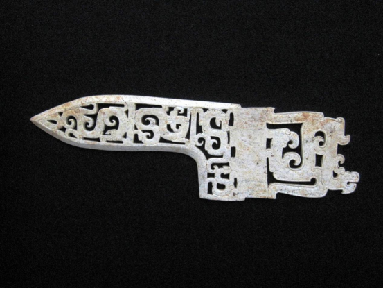 透雕龙蛇纹玉戈:全长23厘米,宽7厘米,厚0.5厘米,国家一级文物。