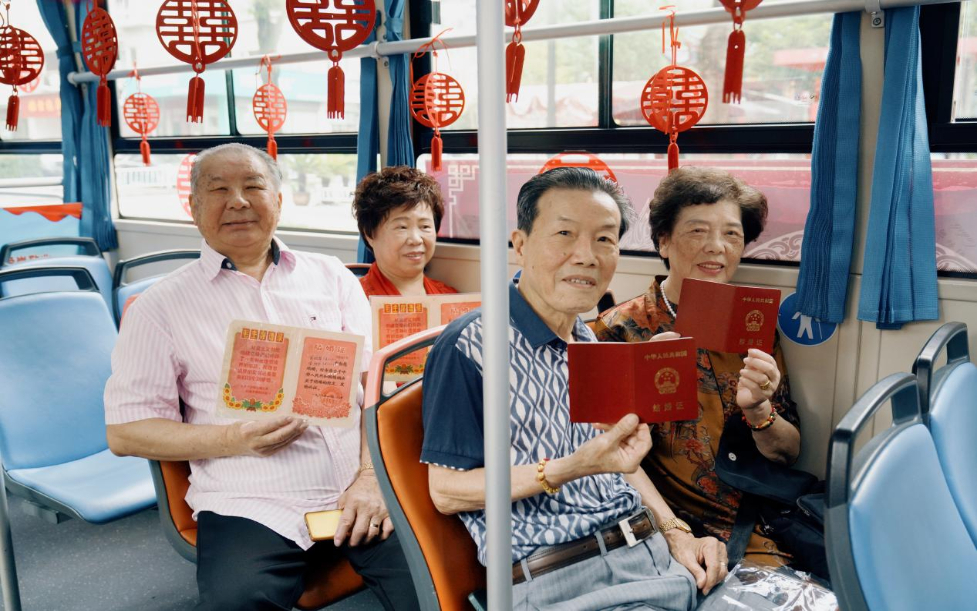 仪式开始前,为了弥补其中四对金婚老人未领过结婚证的遗憾,活动特意“征用”了“温州市道德模范”许延林为司机,“道德模范示范车”公交车为“婚车”,带领老人们补办结婚证。