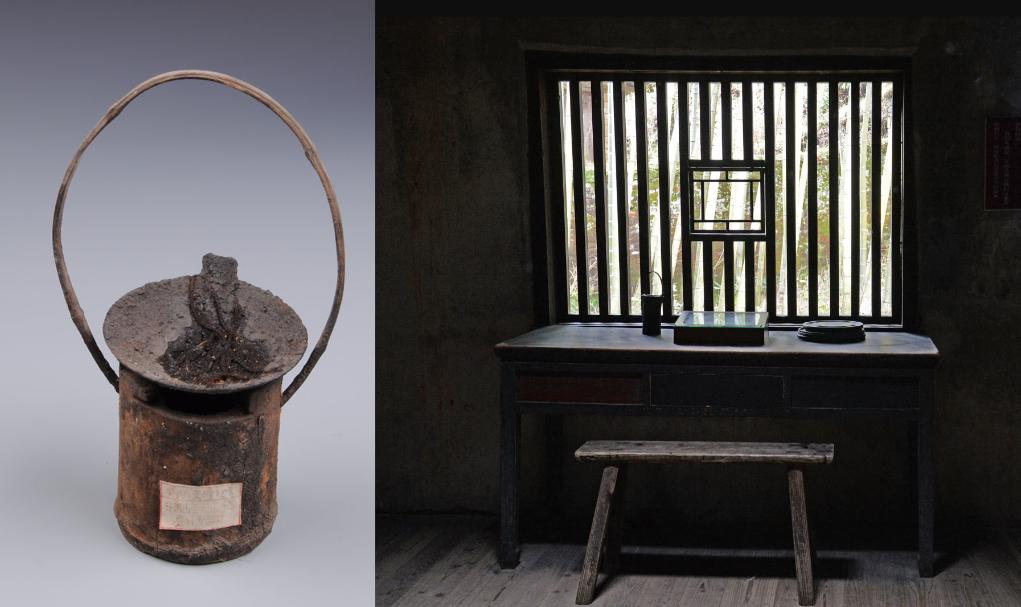 拼版图片:左图为毛泽东在八角楼居住时使用过的清油灯,为国家一级文物(井冈山革命博物馆供图);右图为八角楼毛泽东旧居内景(新华社记者万象 摄)。新华社发