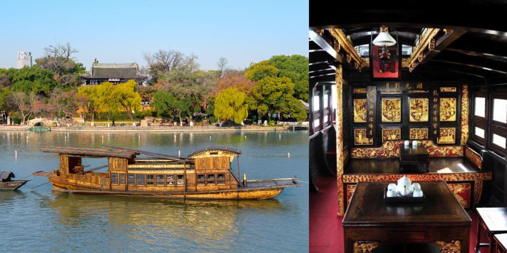 拼版图片:左图为红船静静地停泊在嘉兴南湖的湖面上(盛建生 摄),右图为红船中舱(杨晓东 摄)。新华社发