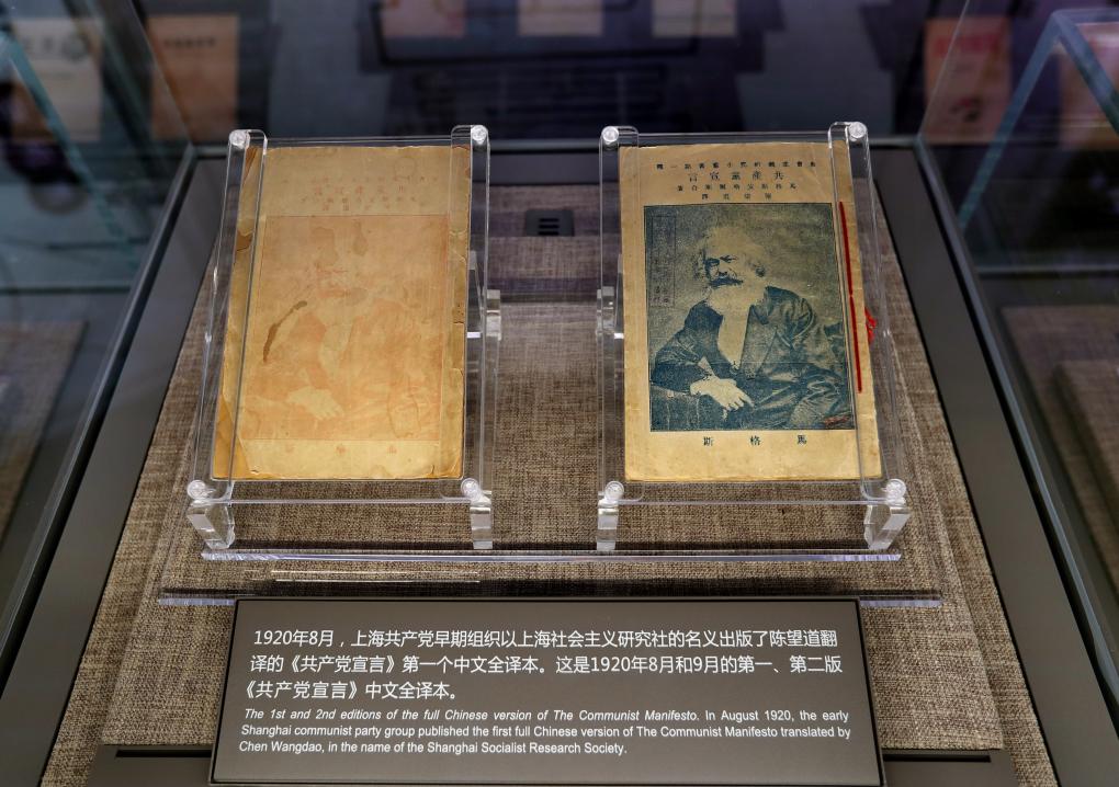 会址东侧不远处,是2021年开馆的中共一大纪念馆新馆,馆内“真理的味道”展项正前方玻璃柜内,静静躺着两本颜色泛黄、封面印有马克思照片的小册子,正是《共产党宣言》首个中文全译本。