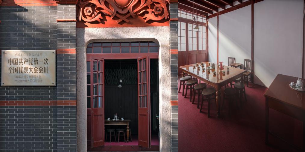 拼版图片:左图为位于上海市兴业路76号(原望志路106号)的中共一大会址(新华社记者刘颖 摄),右图为中共一大会址原址房间内部(中共一大纪念馆供图)。新华社发