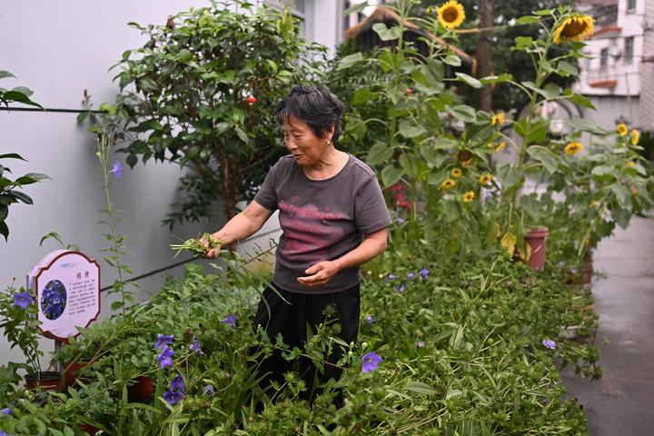 6月19日,在浙江省衢州市常山县辉埠镇路里坑村,村民朱淑兰在养护庭院里种植的花卉。新华每日电讯记者 黄宗治摄