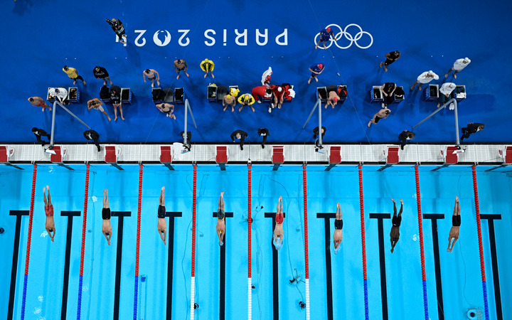7月27日,中国队第一棒选手潘展乐(右四)在比赛中出发。中国队获得第四名。新华社记者 夏一方 摄