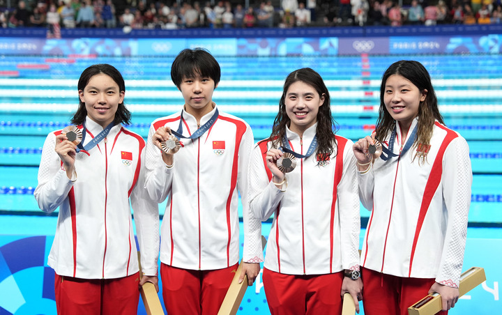 在拉德芳斯体育馆,由杨浚瑄、程玉洁、张雨霏、吴卿风组成的中国队在巴黎奥运会女子4X100米自由泳接力决赛中以打破亚洲纪录的成绩摘得铜牌,这是中国队在该项目上的首枚奥运会奖牌。