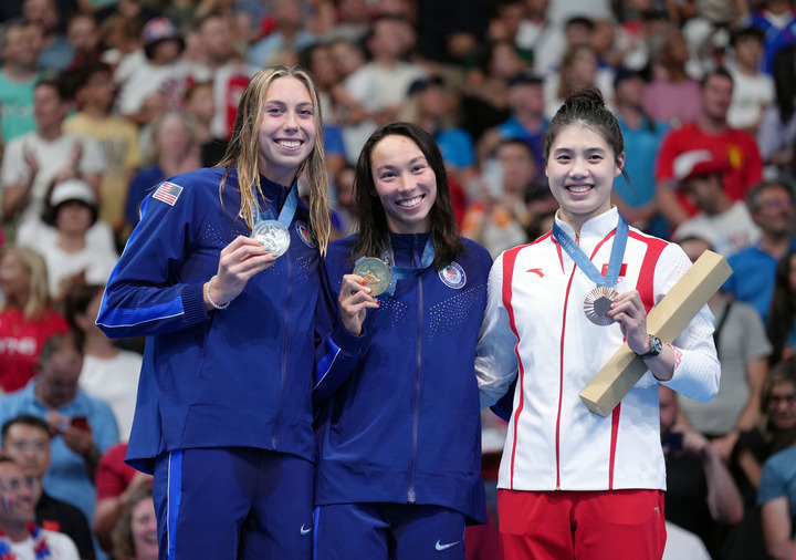 7月28日,冠军美国选手胡斯克(中)、亚军美国选手沃尔什(左)、季军中国选手张雨霏在颁奖仪式上合影。新华社记者 杜宇 摄
