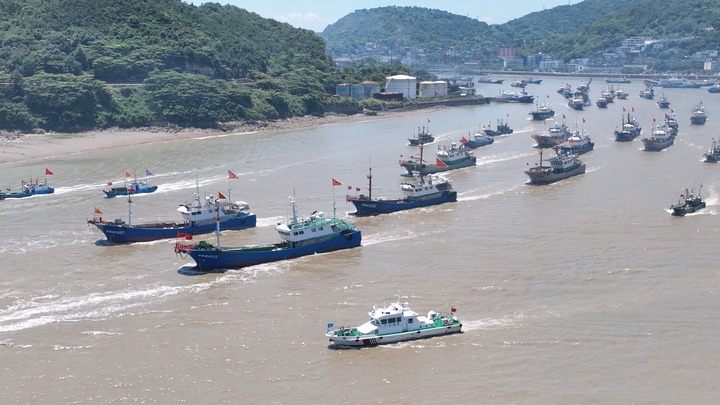 8月1日12时整,在浙江宁波象山石浦渔港,千余艘渔船在响彻海面的鸣笛声、彩炮声中拔锚起航,迎接解禁后的首批开捕。