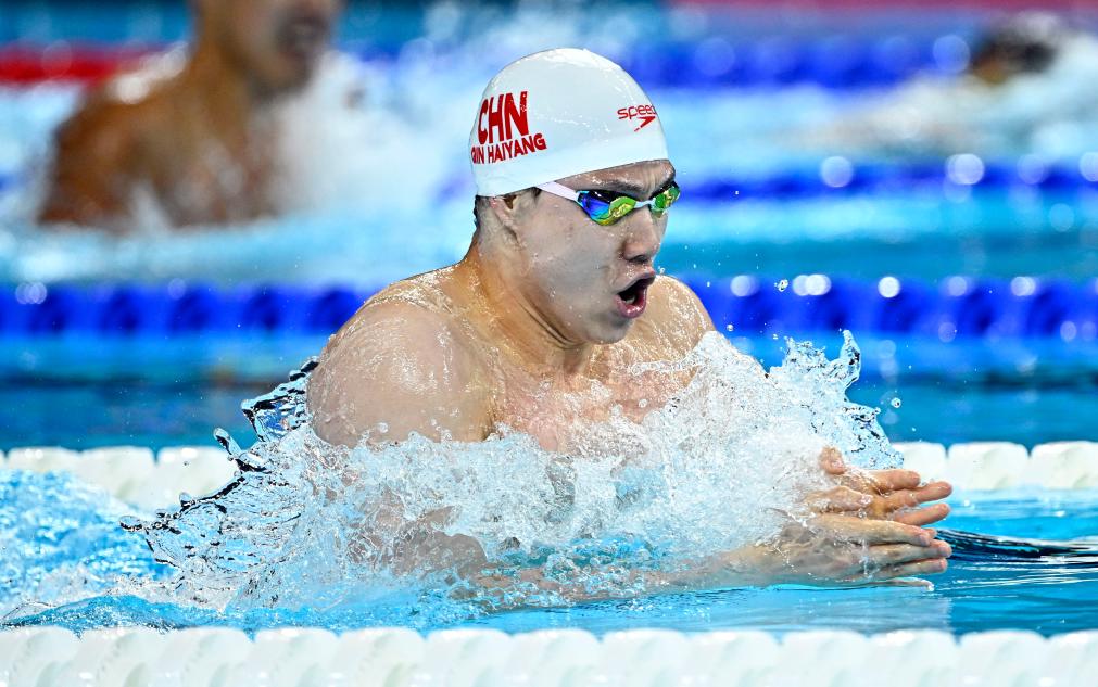 8月4日,中国队选手覃海洋在巴黎奥运会游泳项目男子4X100米混合泳接力决赛中。新华社记者 王鹏 摄
