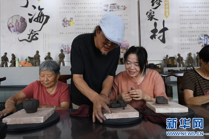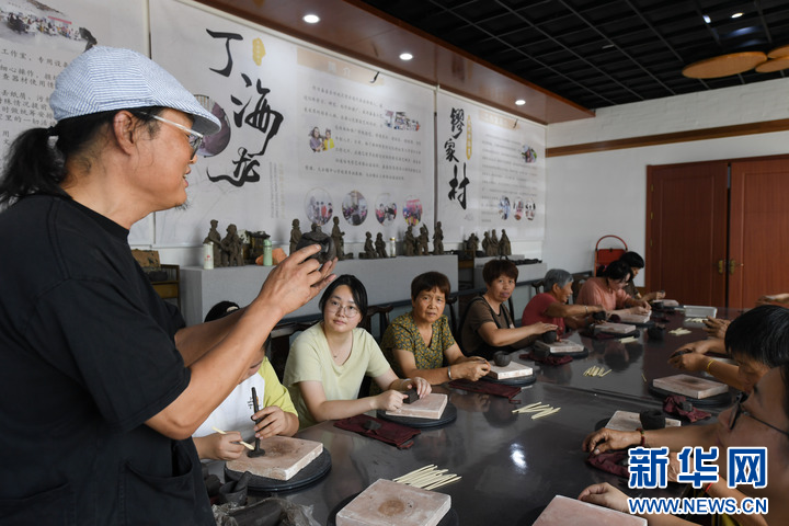 8月6日,在浙江省嘉善县缪家村文化礼堂,文化特派员、嘉兴市非物质文化遗产泥塑项目代表性传承人丁海龙指导村民做茶壶。新华社记者 翁忻旸 摄