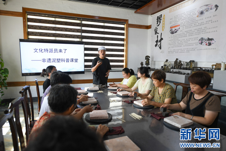 8月6日,在浙江省嘉善县缪家村文化礼堂,文化特派员、嘉兴市非物质文化遗产泥塑项目代表性传承人丁海龙指导村民制作泥塑。新华社记者 翁忻旸 摄