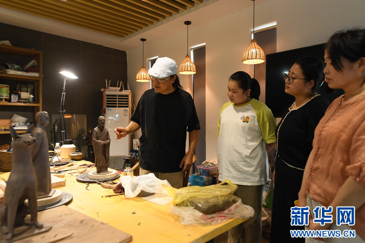 8月6日,在浙江省嘉善县缪家村,文化特派员、嘉兴市非物质文化遗产泥塑项目代表性传承人丁海龙向村民介绍自己正在创作的泥塑作品。新华社记者 翁忻旸 摄