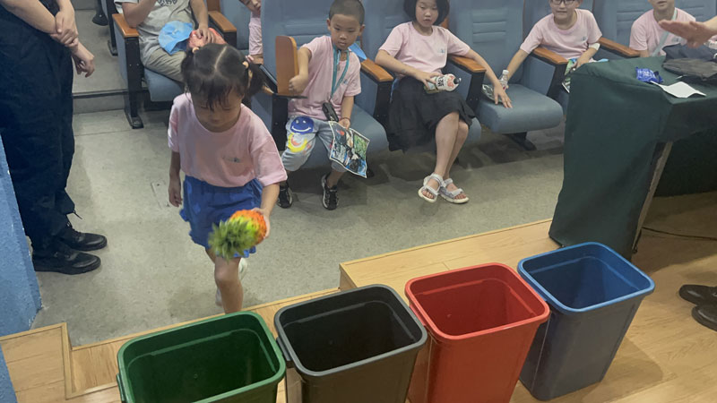 “垃圾分类大挑战”游戏环节,小朋友们热情高涨,纷纷举手参与。他们充分利用现场学到的知识,准确地将各种垃圾投入对应的垃圾桶中。
