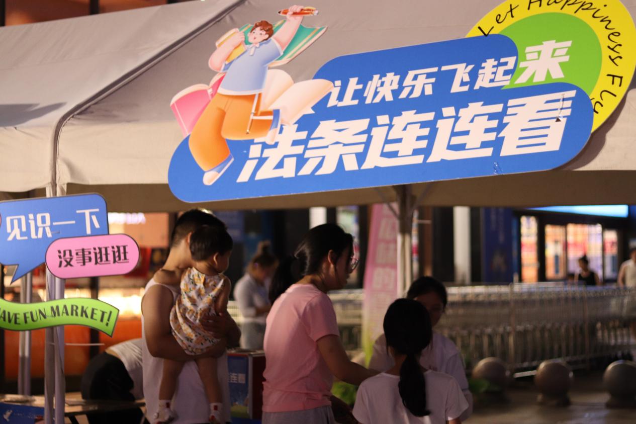 普法集市设计了摊位展板和互动游戏,吸引群众参与到活动中来。“法条连连看”抽奖活动融入了《农村集体经济组织法》《物业管理条例》和《民法典》中婚姻家庭编的核心内容,“热‘法’朝天 清凉一夏”摊位上的“普法柠檬茶”结合抽奖活动进行免费派送,群众在享受茶饮解暑的同时,能随机解锁“法条”,学习法律知识。“法治飞行棋”在游戏中结合了《未成年人保护法》相关知识,以寓教于乐的方式让青少年加深对法律的理解。此外,拍照打卡区更是成为法治宣传新亮点,群众手持法律宣传牌拍照留念,将法治元素融入日常生活,传递正能量。