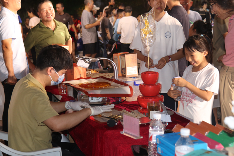活动现场,棕编、糖画、捏泥人……各类非遗技艺作品精彩纷呈,让人目不暇接;邵永丰麻饼、喜多滋水晶糕等非遗美食的摊位前人头攒动,吸引了众多食客驻足品尝。此外,剪纸、叶画等文创产品也以其独特的艺术魅力,赢得了游客们的青睐。