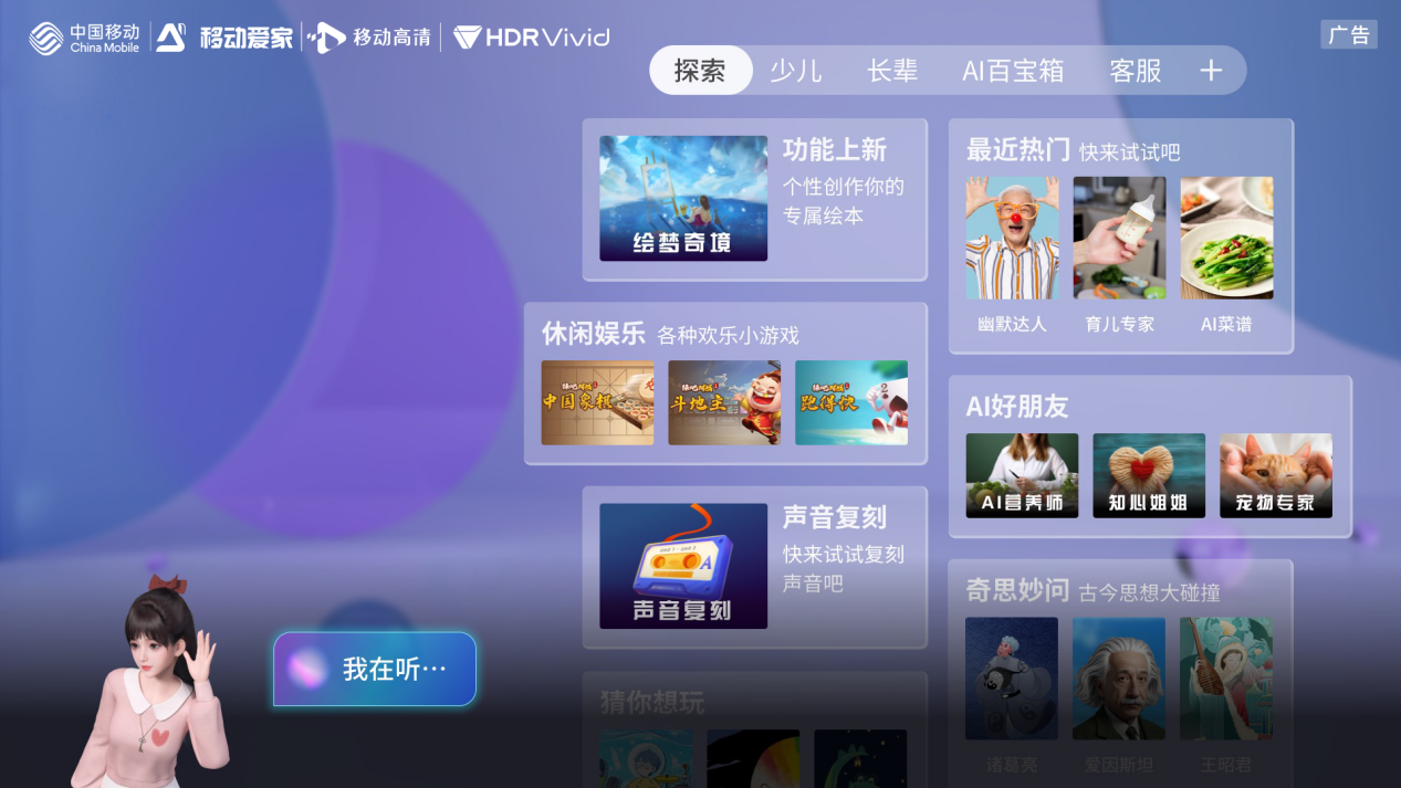 移动高清是移动爱家品牌旗下的优质电视产品,具备内容全、速度快、操控智三大业务优势,提供看、学、动、听、玩全家庭场景互动娱乐服务。为营造轻松、欢乐的中秋节日氛围,移动高清电视推出“趣话中秋乐,天涯共此时”全网活动,通过HDR Vivid超高清技术、AI大模型等技术能力,为用户带来丰富多元的观看和互动体验,为家人团聚时光增添无限乐趣。