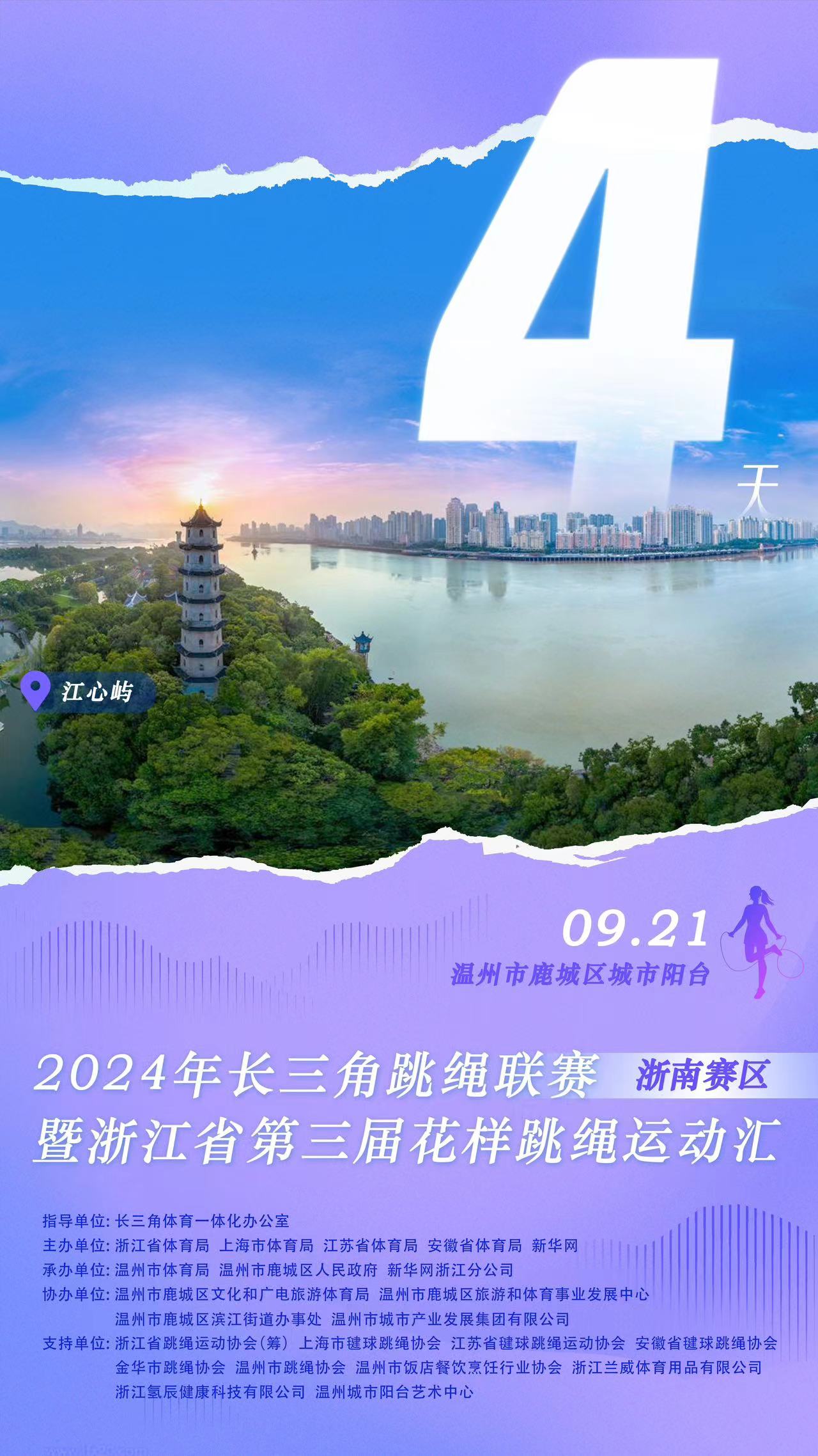 鹿城秋韵,绳舞翩翩!2024年长三角跳绳联赛暨浙江省第三届花样跳绳运动汇(浙南赛区)将于9月21日在温州鹿城盛大开幕。亲爱的跳绳爱好者们,这场关于速度、技巧与激情的较量,你们准备好了吗?