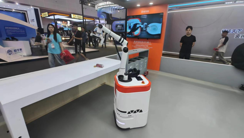 只见一个机器人灵活地在模拟的公共办公空间内穿梭,随意丢弃的纸屑被精准地拾起并投入可回收垃圾箱中,桌面上不慎洒落的可乐也被它细心地吸尘、烘干,直至桌面恢复整洁如新……在第三届全球数字贸易博览会的现场,这个场景吸引了众多参观者驻足——杭州星物种机器人有限公司正展示其首创的具身智能清洁机器人。