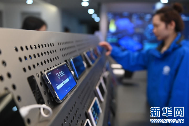 在位于杭州的蒲惠智造的办公区,展台摆放着手机等设备进行系统兼容性测试(2024年3月18日摄)。新华社记者 黄宗治 摄