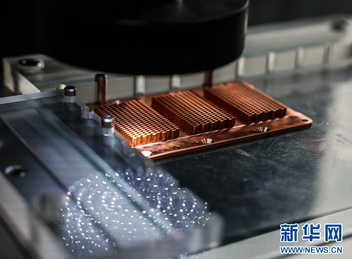 2024年4月16日,在位于诸暨市的海特信科新材料科技有限公司检测实验室内,工作人员在检测用于新能源汽车的针式散热铜基板。新华社记者 徐昱 摄