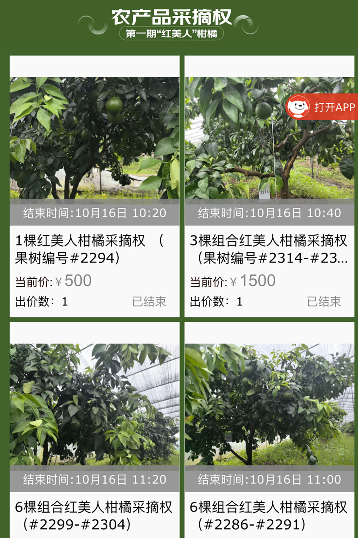水果采摘权也能拍卖。10月16日,经过24小时竞拍,浙江瑞安一家农场的160余株柑橘采摘权在京东平台卖出81601元。据悉,采摘权线上竞拍,是瑞安帮助果农拓宽销售渠道的创新尝试,也是瑞安“三位一体”改革助农增收的新探索。