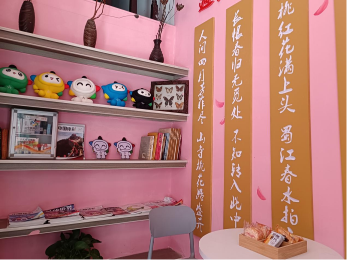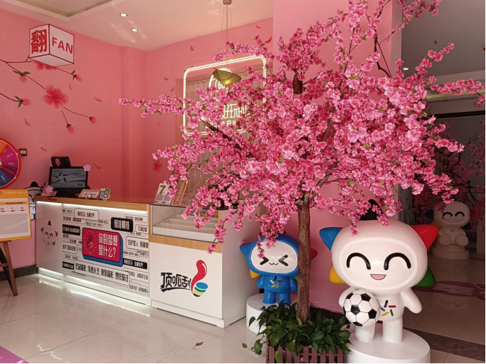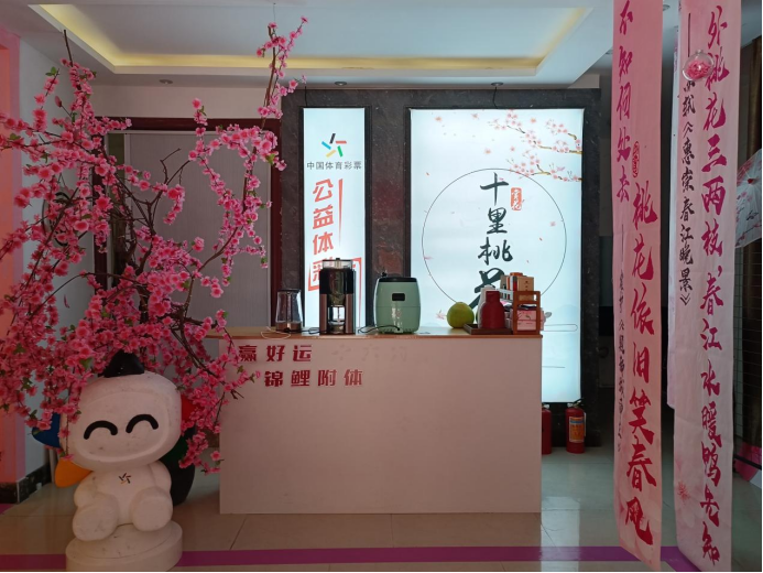 在这家105平方米的体彩实体店,“桃花”是当之无愧的主角。一进门,仿真桃花树下的“乐小星”笑容可掬;随风轻扬的布幔上,写满了古往今来与桃花相关的诗词佳句;贴满了中奖彩票的幸运展示区,是盛放的五瓣桃花造型;目光转向角落里的茶桌,连餐巾纸都“披着”桃花图案的“外袍”……处处陈设和布置,都设计巧妙地汲取了古典美与潮玩元素,雅致而不失现代感。