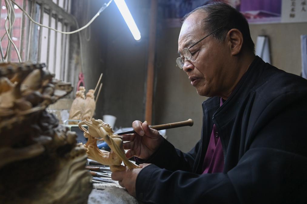 虞金顺在工作室雕刻一件乐清黄杨木雕作品(11月25日摄)。