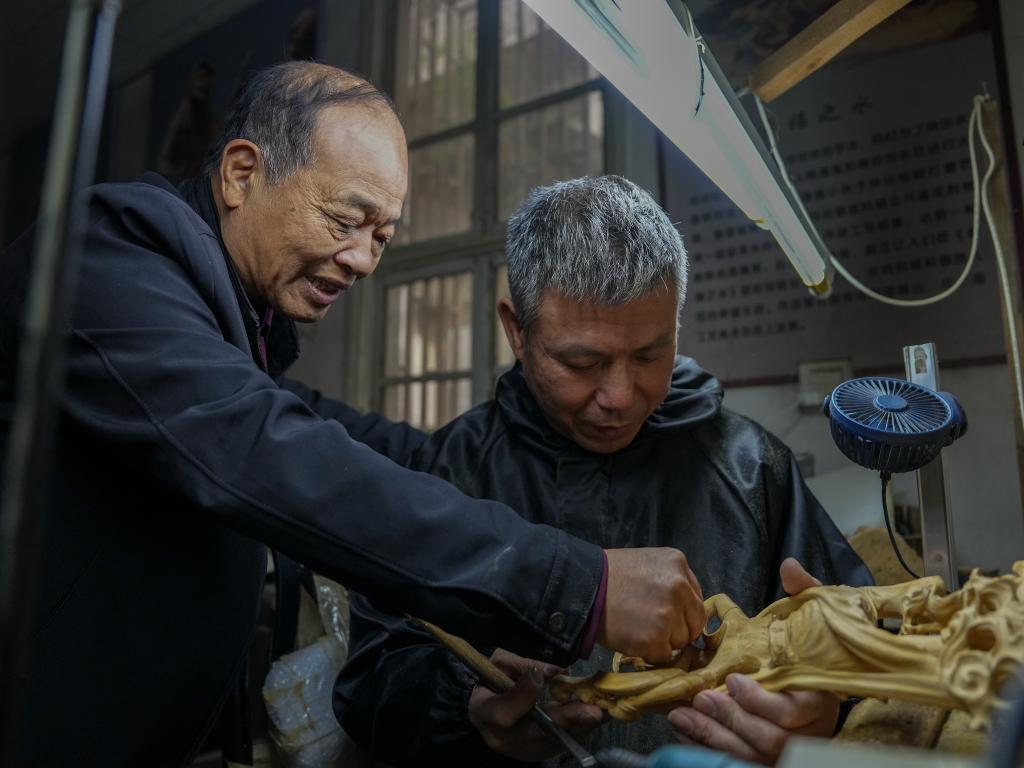 虞金顺(左)在工作室指导学生李毅雕刻(11月25日摄)。