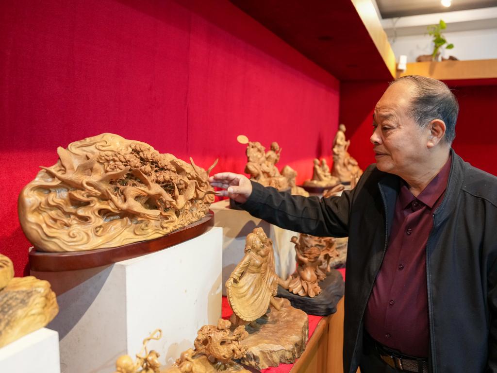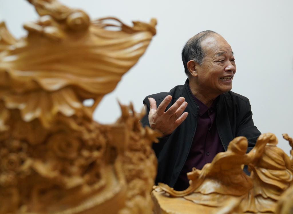 虞金顺在工作室展示自己创作的乐清黄杨木雕作品(11月25日摄)。