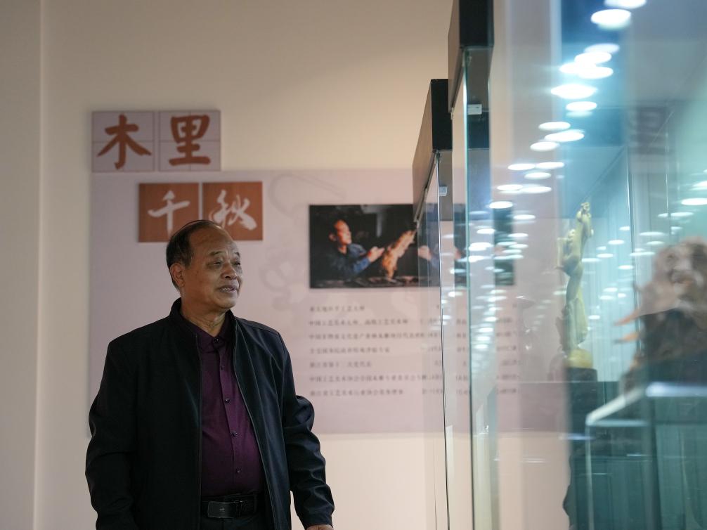 虞金顺在艺术馆观看自己创作的乐清黄杨木雕作品展览(11月25日摄)。