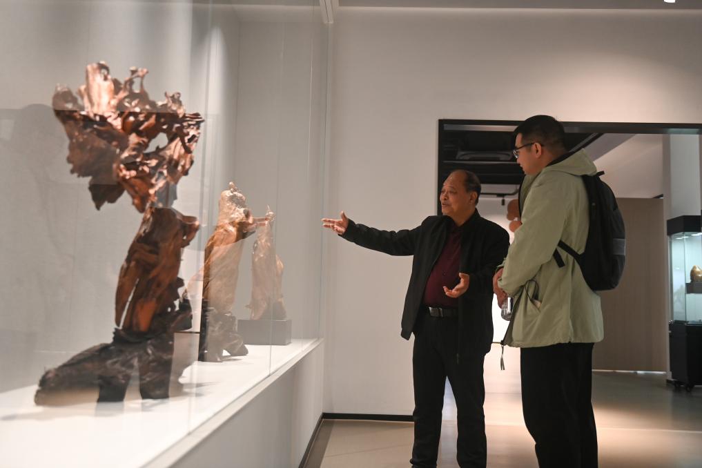 虞金顺(左)在艺术馆展示介绍自己创作的乐清黄杨木雕作品(11月25日摄)。